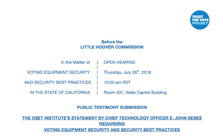 As part of my work with the OSET Institute we submitted were asked to comment on Voting Equipment Security and Security Best Practices in the State of California to the Little Hoover Government Commission. July 26, 2018 Here is a link to our submission.
